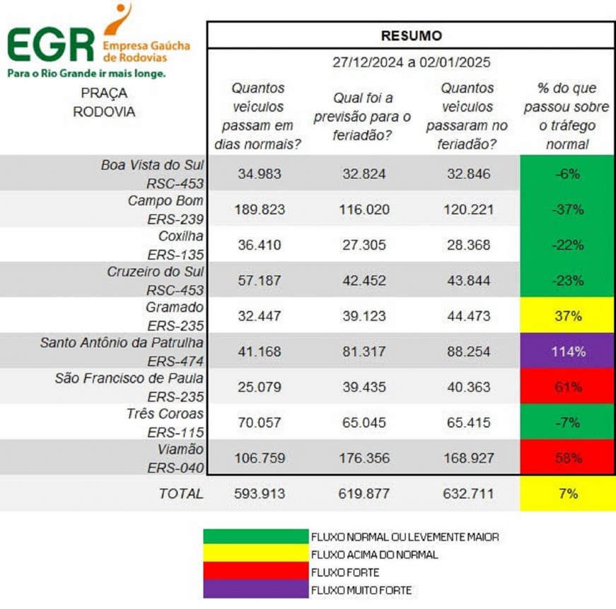A Empresa Gaúcha de Rodovias (EGR), por meio da Gerência Operacional (Goper), divulgou o balanço das ações realizadas no feriado de Ano-Novo nas rodovias estaduais administradas. Conforme o levantamento, 632,7 mil veículos passaram pelas praças de pedágio da EGR entre sexta (27.12) e quinta-feira (02.01). O total representa um aumento de 7% em relação ao volume de tráfego em dias normais. Na comparação com o feriado do ano passado, em que 488,9 mil veículos passaram pelas praças de pedágio, houve um aumento de 143,8 mil veículos que circularam pelas estradas da EGR, o equivalente a quase 30%.